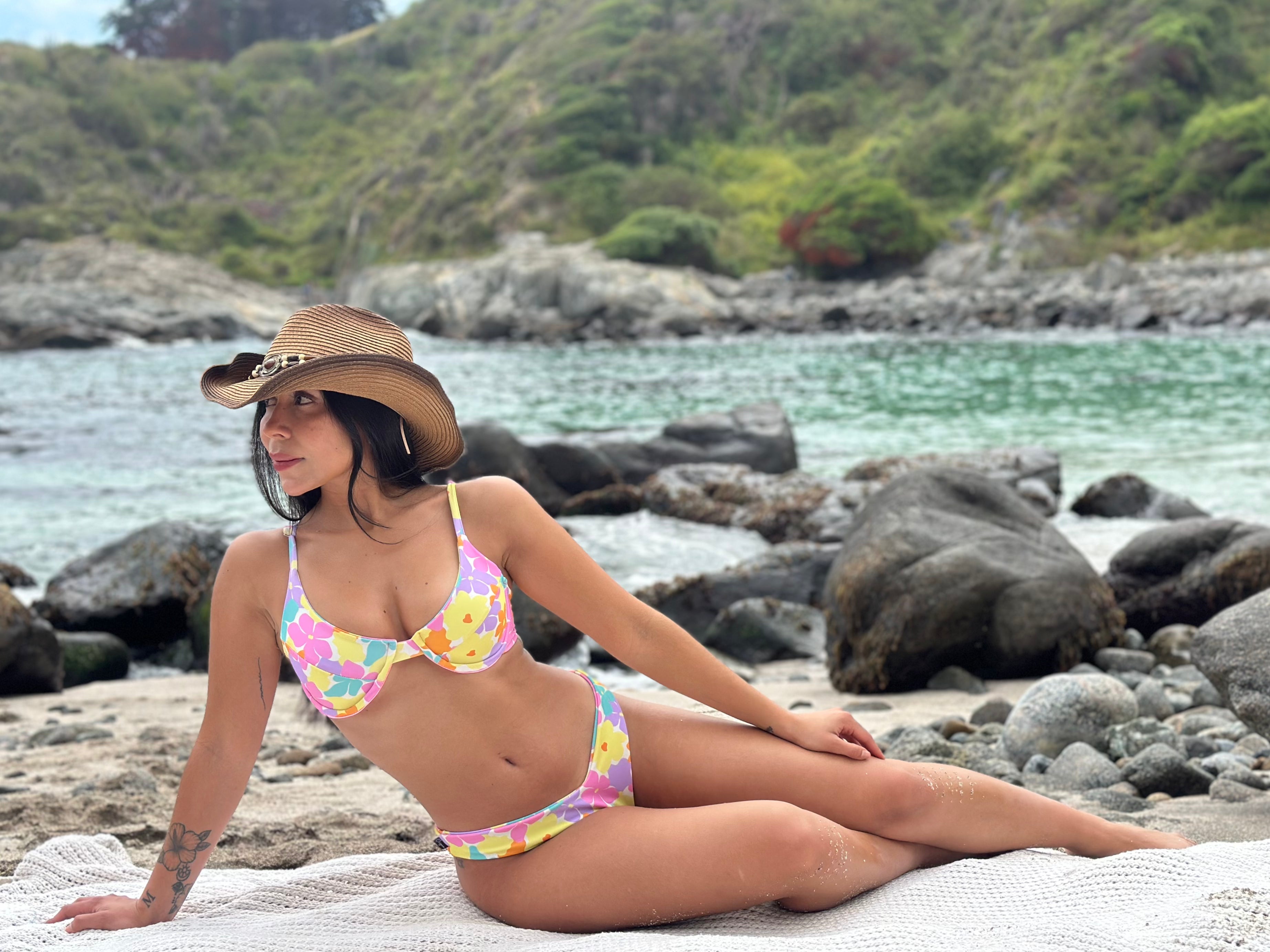 La modelo usa talla S de sostén y talla S en la parte inferior. El sostén es CIEL con aro y sin relleno, con tirantes REGULABLES para mejor calce. Tiene tonos ROSADOS, ideal para un look FRESCO. La parte inferior es de corte GRETEL. Confeccionado en tela suave, elástica y de secado rápido.