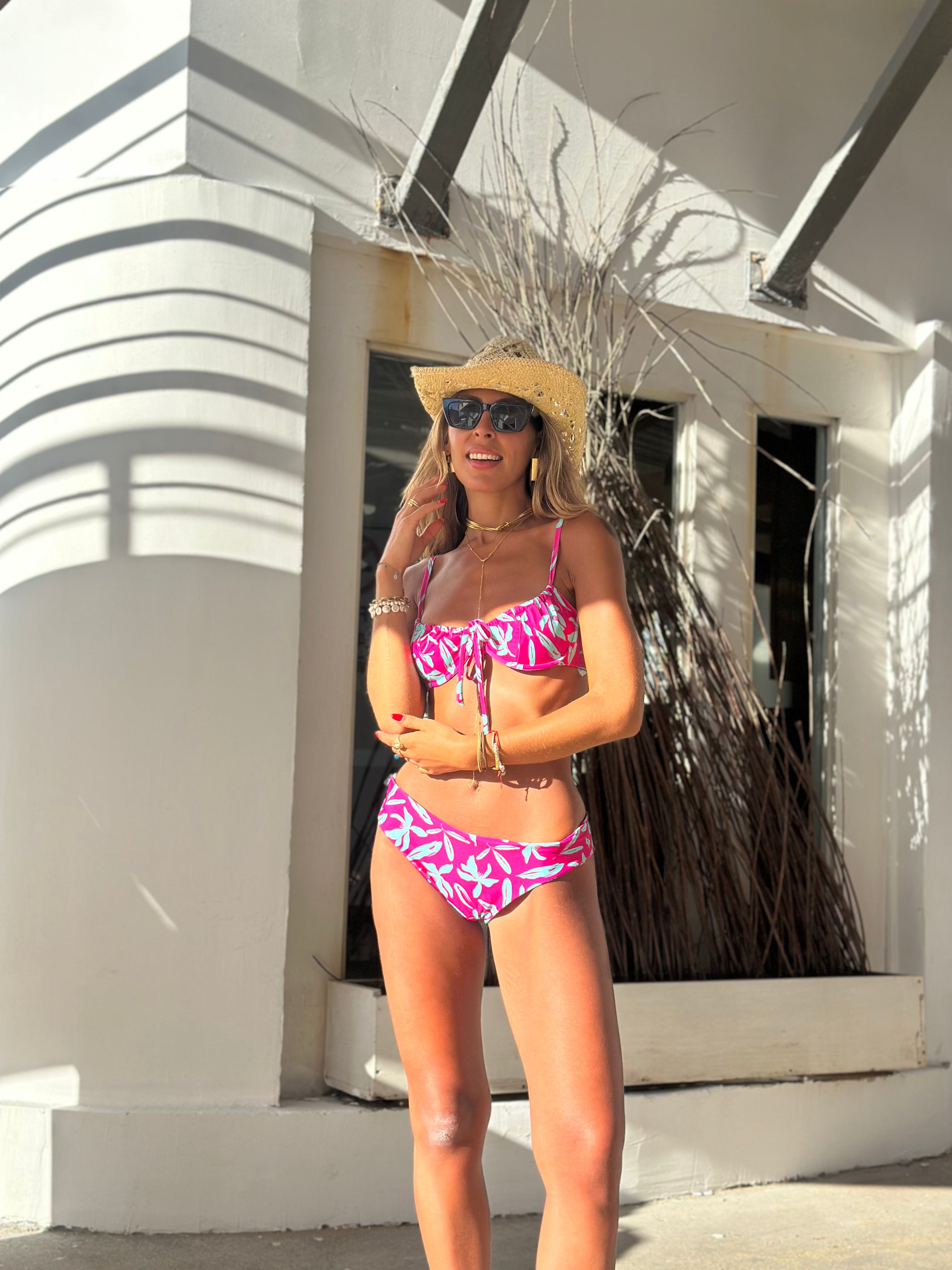 La modelo usa talla S de sostén y talla S en la parte inferior. El sostén es GIULIA con aro y sin relleno, con tirantes REGULABLES para mejor calce. Tiene tonos ROSADOS, ideal para un look FRESCO. La parte inferior es de corte ZOE. Confeccionado en tela suave, elástica y de secado rápido.